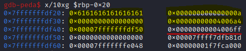 x/10xg $rbp-0x20 이라고 입력하면 되고,