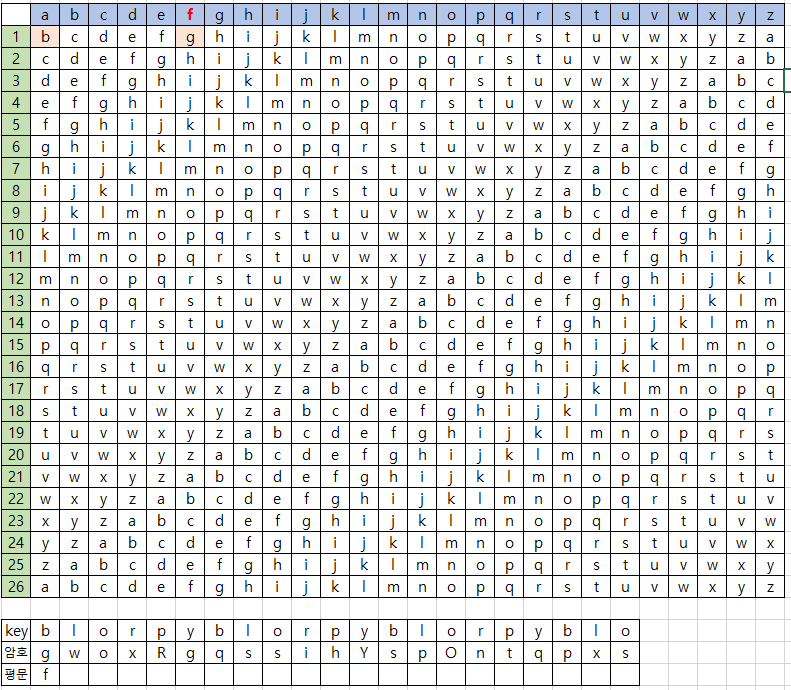 1번 행에서 암호문의 첫글자인 g를 찾고, 이 g가 있는 부분의 열 이름(파란색)을 읽어주면 된다.