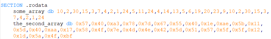the_second_array db 0x57,0x40,0xa3,0x78,0x7d,0x67,0x55,0x40,0x1e,0xae,0x5b,0x11,0x5d,0x40,0xaa,0x17,0x58,0x4f,0x7e,0x4d,0x4e,0x42,0x5d,0x51,0x57,0x5f,0x5f,0x12,0x1d,0x5a,0x4f,0xbf