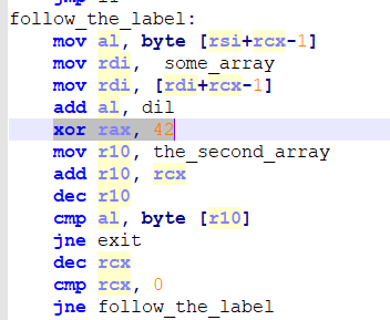 (the_second_array ^ 42) - some_array[i] 한 값을 차례로 flag 변수에 넣어주면 된다.