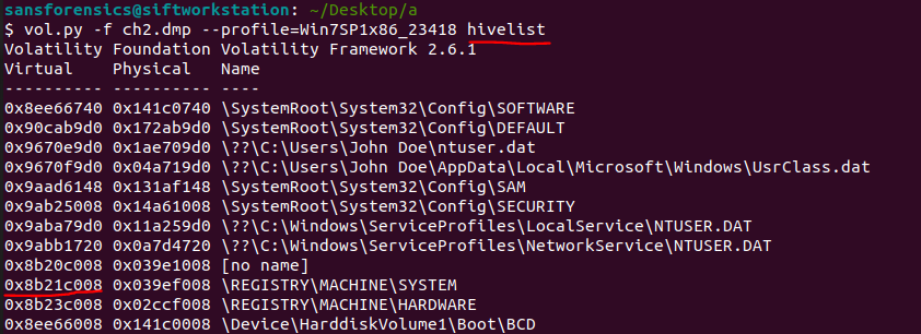 먼저 hivelist 플러그인을 이용해 SYSTEM 하이브 파일의 Virtual 주소를 확인한다.