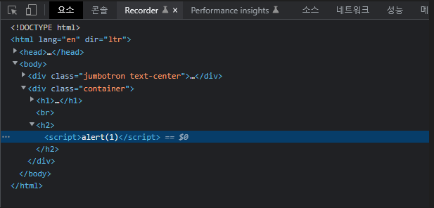 입력한 <script>alert(1)</script> 가 잘 들어가 있는것을 볼 수 있다.