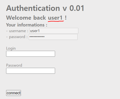 당연하게 Error : no such user/password 라는 문구가 출력된다.