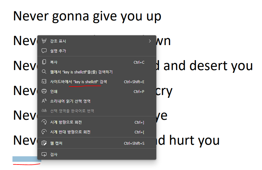 그럼 나오는 메뉴에서 key is shellctf 라는 내용을 발견할 수 있다.