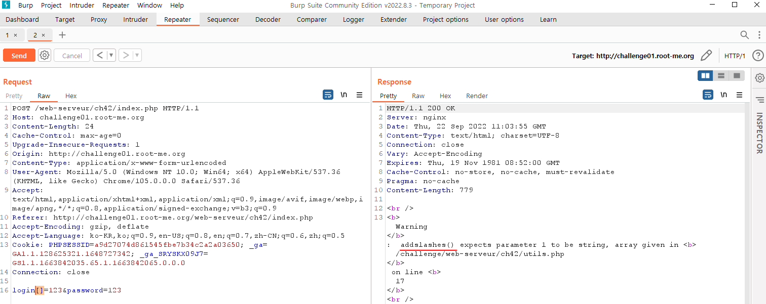 사용자의 아이디를 전달하는 login 변수의 뒤에 [] 를 붙여서 패킷을 보내봤더니