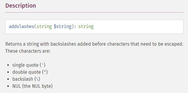 addslashes 함수는 입력값에 작은따옴표, 쌍따옴표, 역슬래시, Null 바이트가 있으면