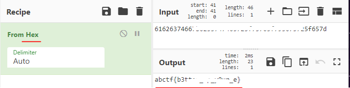 출력된 값을 CyberChef(https://gchq.github.io/CyberChef)에서 Hex 디코딩해주면 플래그가 나온다.