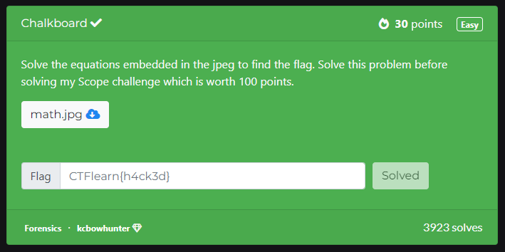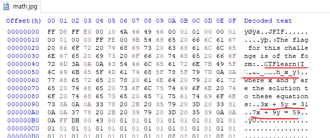 문제 설명을 읽어보면, jpeg 파일에 포함된 방정식을 풀어서 플래그를 찾으라고 한다.