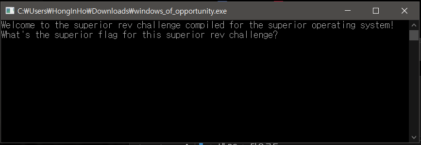 실행을 시켜보면 cmd 창이 하나 뜨면서 이 프로그램에서 플래그를 얻을 수 있냐?
