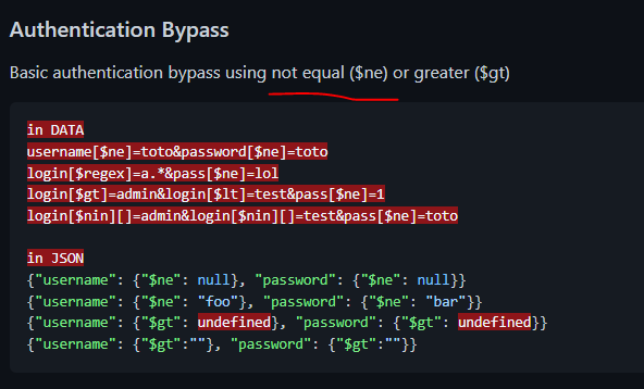 https://github.com/swisskyrepo/PayloadsAllTheThings/tree/master/NoSQL%20Injection
