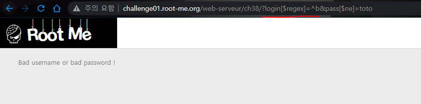 ?login[$regex]=^b&pass[$ne]=toto 라고 입력해서