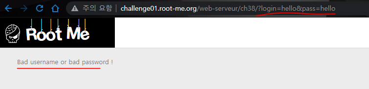 URL을 보니 입력한 ID 와 비밀번호를 GET 방식으로 서버에 전송하고 있다.