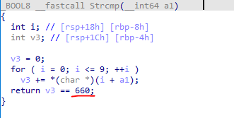 Strcmp 함수는 사용자가 입력한 값의 10번째 까지 더했을때 660이 나오는지 확인하고 있다.