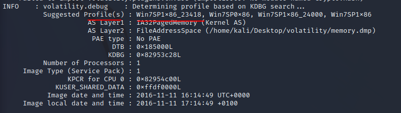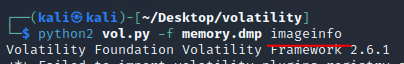 python2 vol.py -f <덤프파일 명> imgaeinfo 라고 명령어를 입력하면 된다.