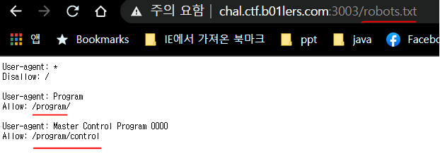 /program/control 경로는 User-agent 가 Master Control Program 0000 인 경우에 접근이 가능함을 볼 수 있다.
