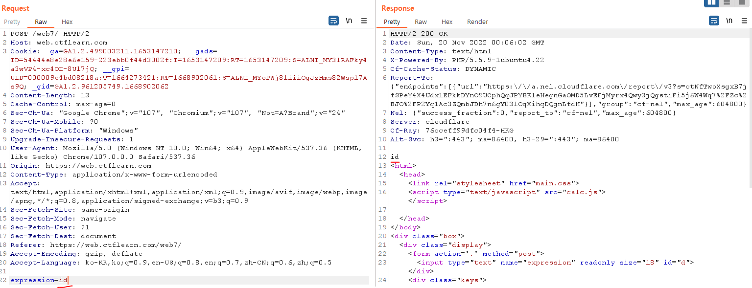 expression 에 id 를 입력하면 문자 id가 그대로 응답 패킷에 출력되는 반면