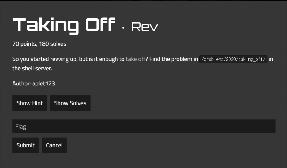 taking_off 라는 바이너리 파일이 하나 주어진다. 역시나 확장자는 없고