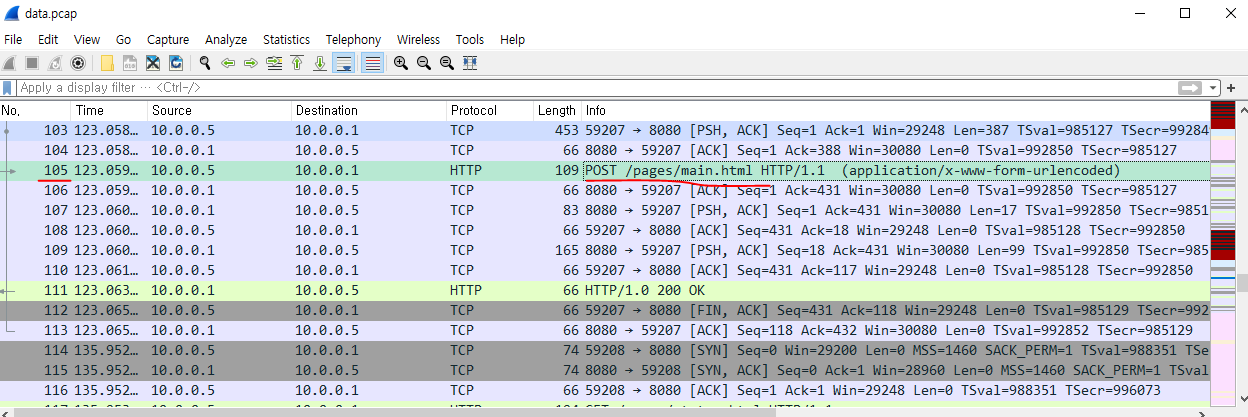 다시 패킷으로 돌아와 105번 패킷을 보면