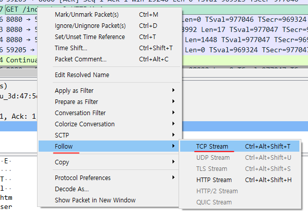 우클릭 - Follow - TCP Stream 버튼을 눌러본다.