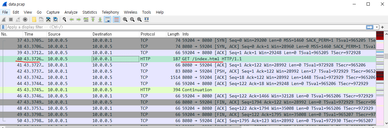 40번 패킷에서 웹으로 /index.html 경로에 접근한 흔적이 보인다.