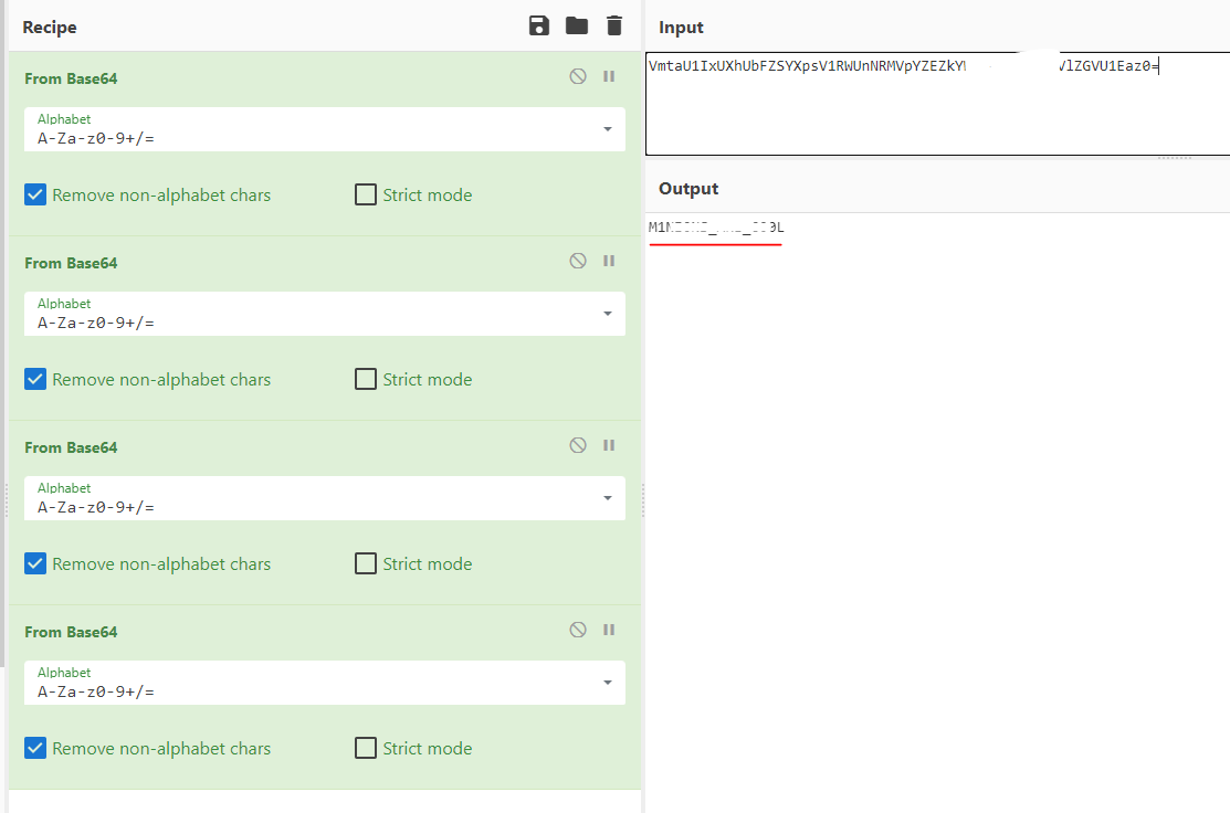 Base64로 네번 디코딩 해주니 플래그가 나왔다.
