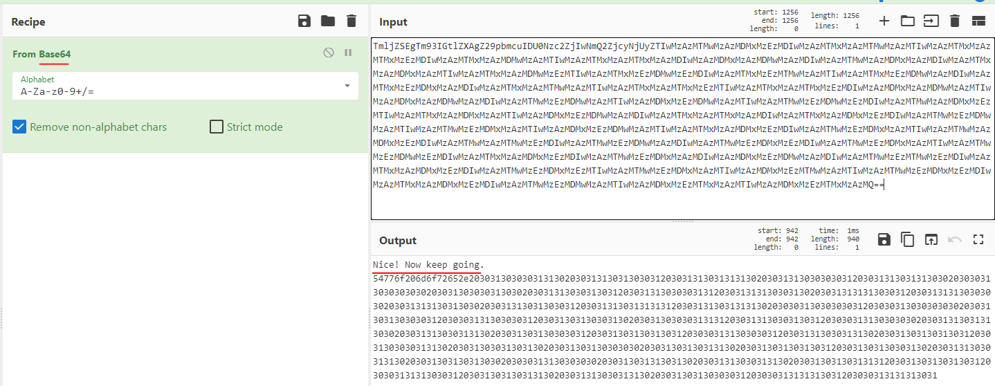 디코딩을 해보면 Nice! Now keep going. 이라는 문구와 함께