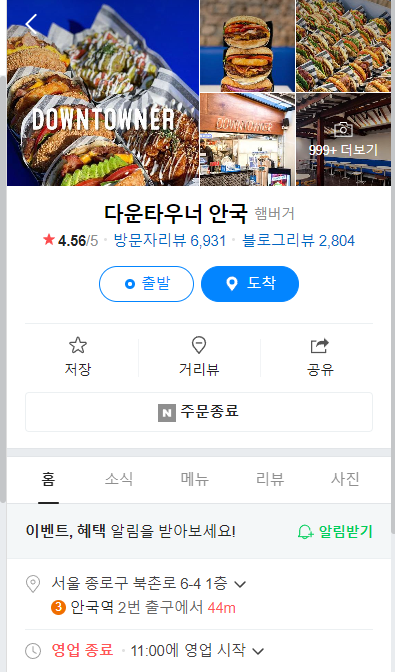 다운타우너의 영업시간은 오전 11시 부터 시작되는데