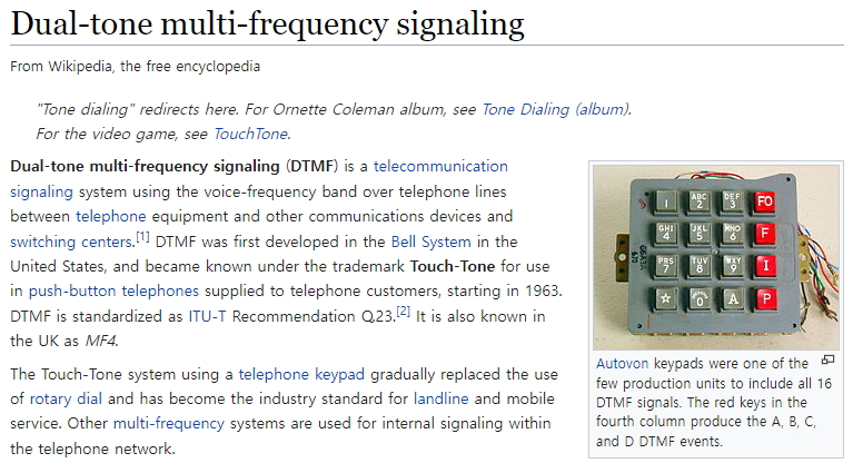 DTMF(Dual-tone multi-frequency signaling) 관련된 내용들을 쉽게 찾을 수 있다.