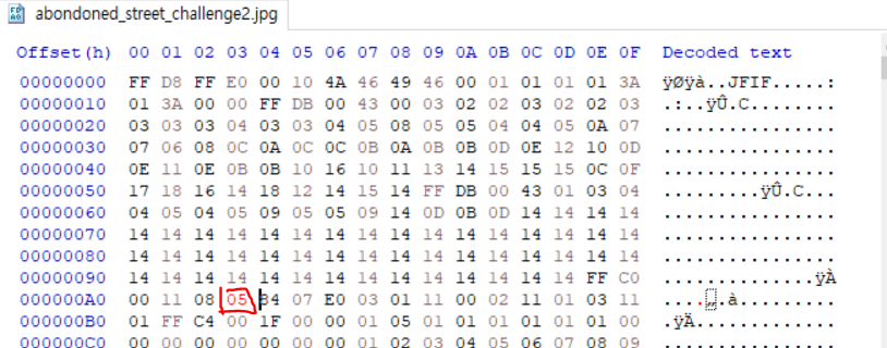 HxD 프로그램을 이용해 주어진 abondoned_street_challenge2.jpg 파일을 열어본다.