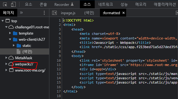 개발자 도구의 '소스' 탭을 보면 웹페이지 자체에는 특이한 내용이 없는걸 볼 수 있다.