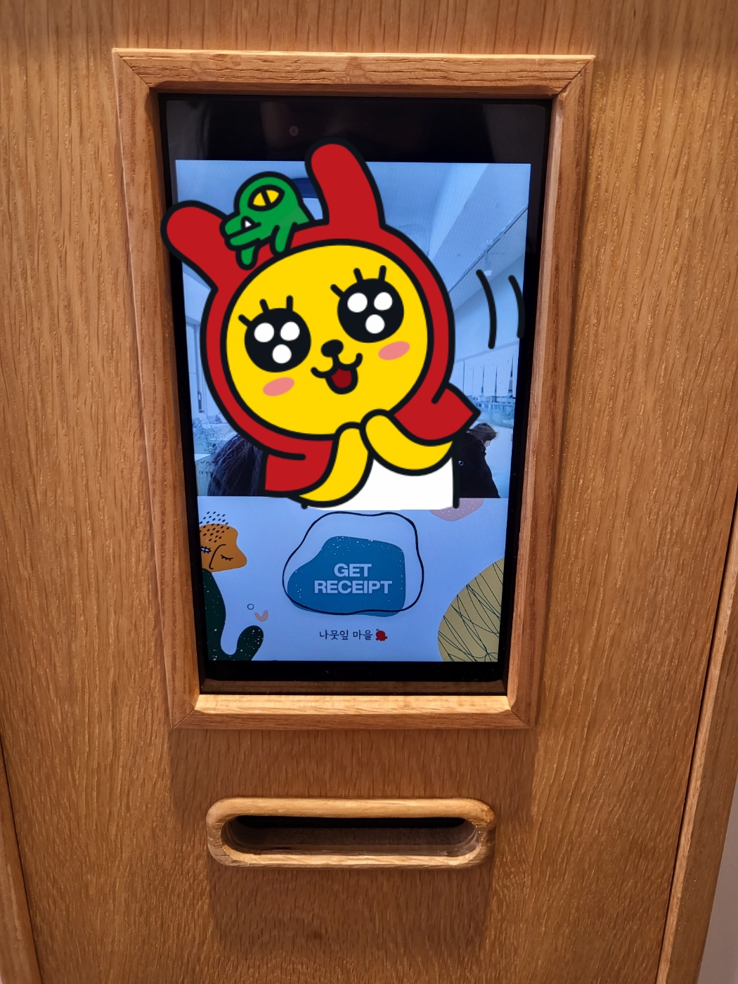 앞에 서서 GET RECEIPT 버튼을 누르면 사진이 찍히고 영수증 종이에 사진이 인화된다.