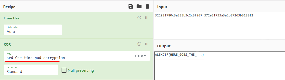 해당 암호문을 ALEXCTF{HERE_GOES_THE_ 로 XOR 하면