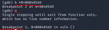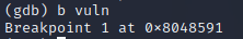 b vuln 이라고 입력해 vuln 함수 시작부분에 브레이크 포인트를 걸어 주었다.