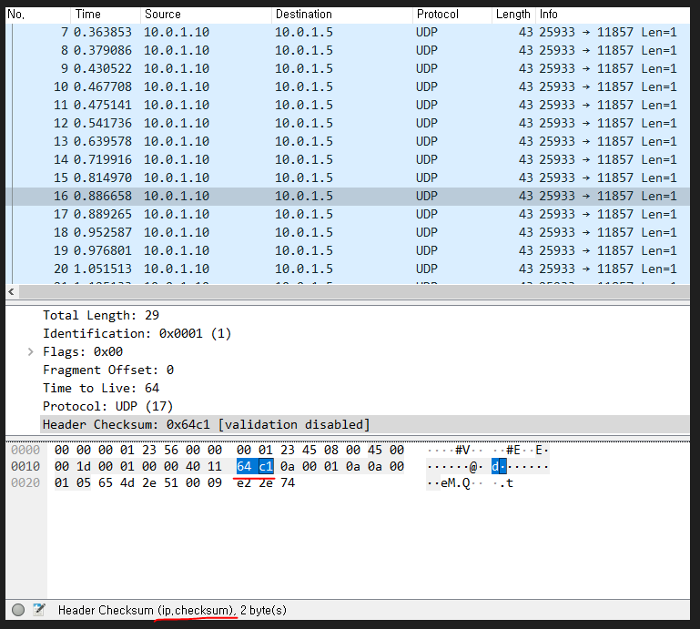 16번 패킷처럼(오른쪽) ip.checksum 부분이 64 c1 인 패킷 두 종류였다.
