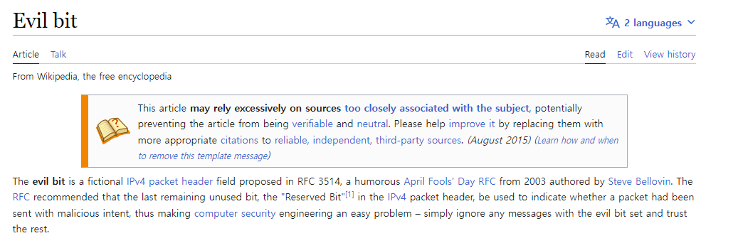 위키피디아 문서가 하나 나오는데 Evil bit 이라는 제목이다.