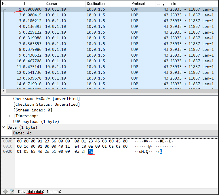 1번 패킷은 4c, 2번패킷은 70 ... 이런식으로 바꿔가며 데이터를 담아서 전송하고 있는것을 볼 수 있다.