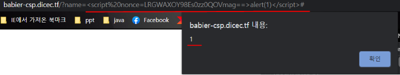 <script nonce=NONCE 값>alert(1)</script> 형태로 입력해보면