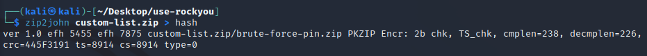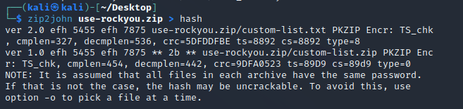 다시한번 zip2john <파일명> > hash 명령어로