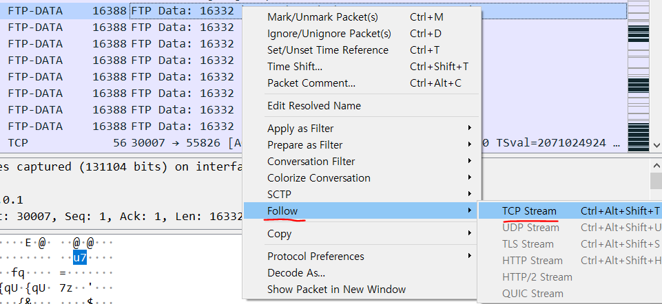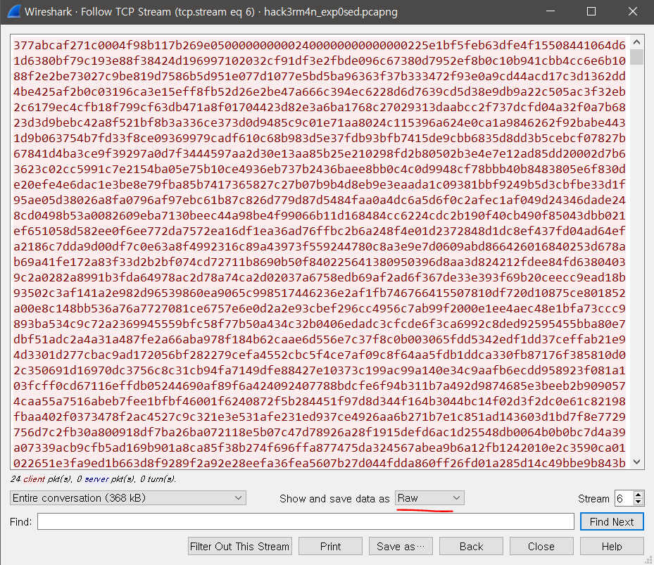 같은 방법으로 우클릭 - Follow - TCP Stream 으로 확인해 봤더니