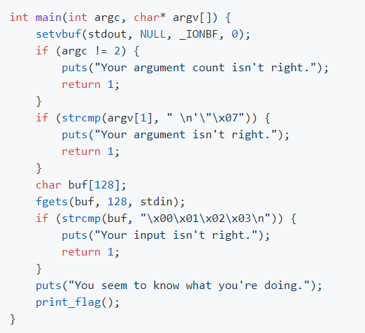 if (strcmp(buf, "\x00\x01\x02\x03\n"))