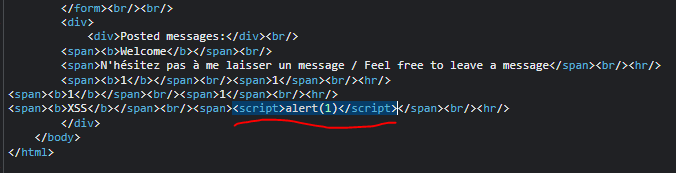 입력했던 <script> 태그가 웹페이지에 삽입되어서 스크립트가 실행된 것이다.