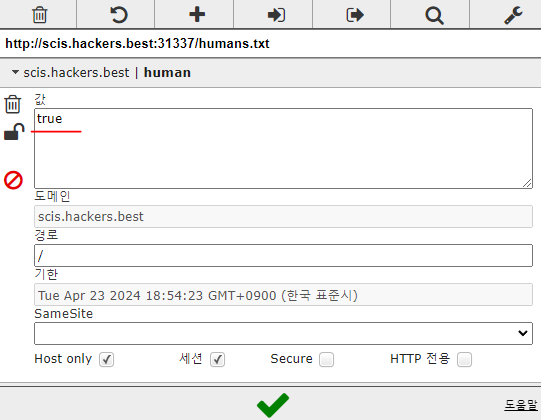 human 이라는 쿠키값이 false 로 설정되어 있는것이 보였다.