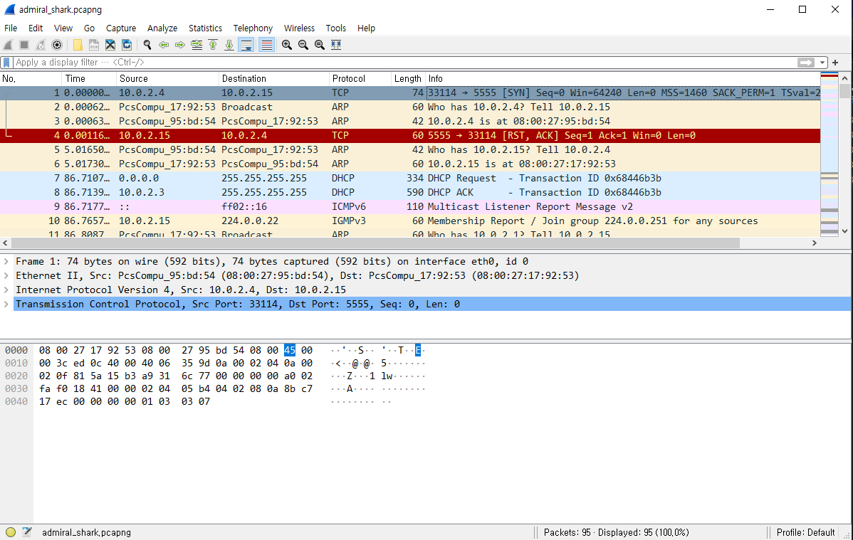 Wireshark로 pcapng 파일을 열어볼 수 있다.