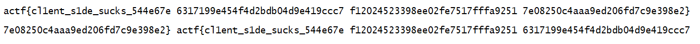 7e08250c4aaa9ed206fd7c9e398e2}actf{cl1ent_s1de_sucks_544e67e6317199e454f4d2bdb04d9e419ccc7f12024523398ee02fe7517fffa9251