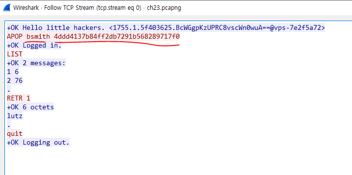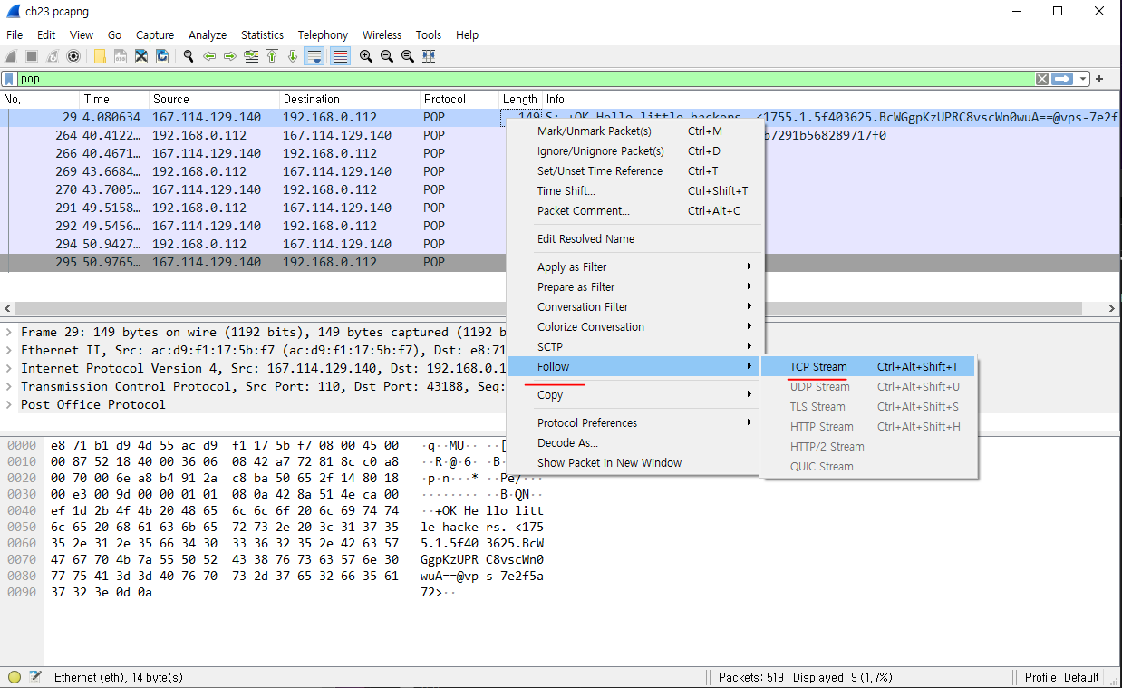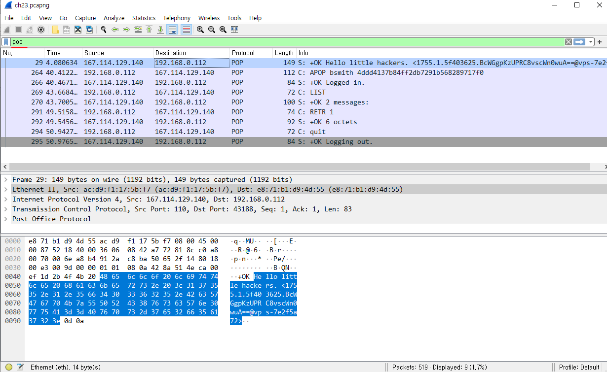 문제 제목에 나와있는 POP 프로토콜 패킷을 찾아본다.