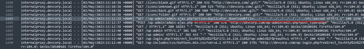 1,684번째 줄에서 ../../../../../../etc/passwd 파일을 가지고 장난치는 것처럼 보이는 로그가 나왔다.