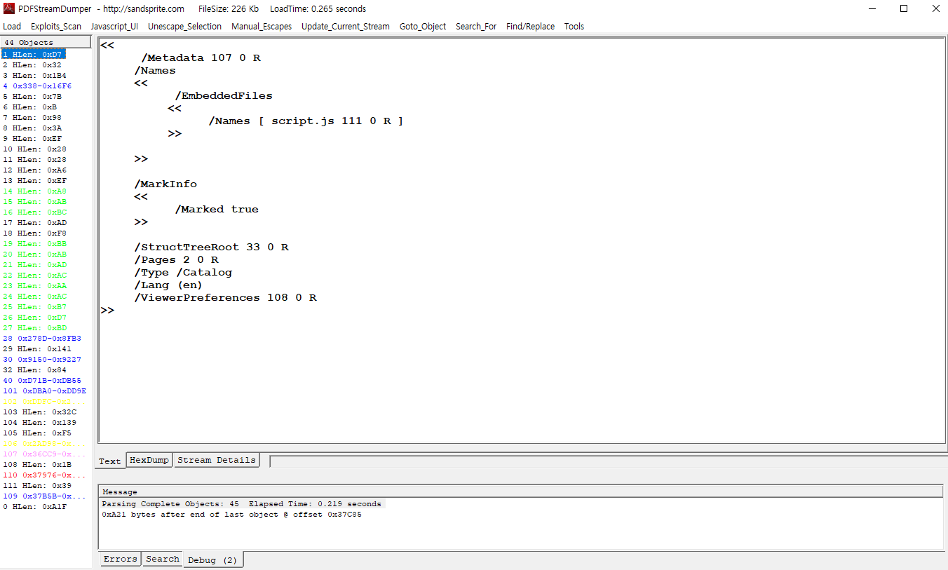 위 사진에서 보이는것 처럼 문제에서 주어진 pdf 파일은 44개의 Object 를 포함하고 있다.