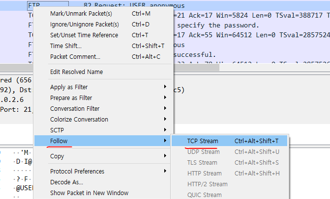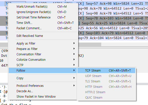TCP 패킷에서 우클릭 - Follow - TCP Stream 을 눌러준다.